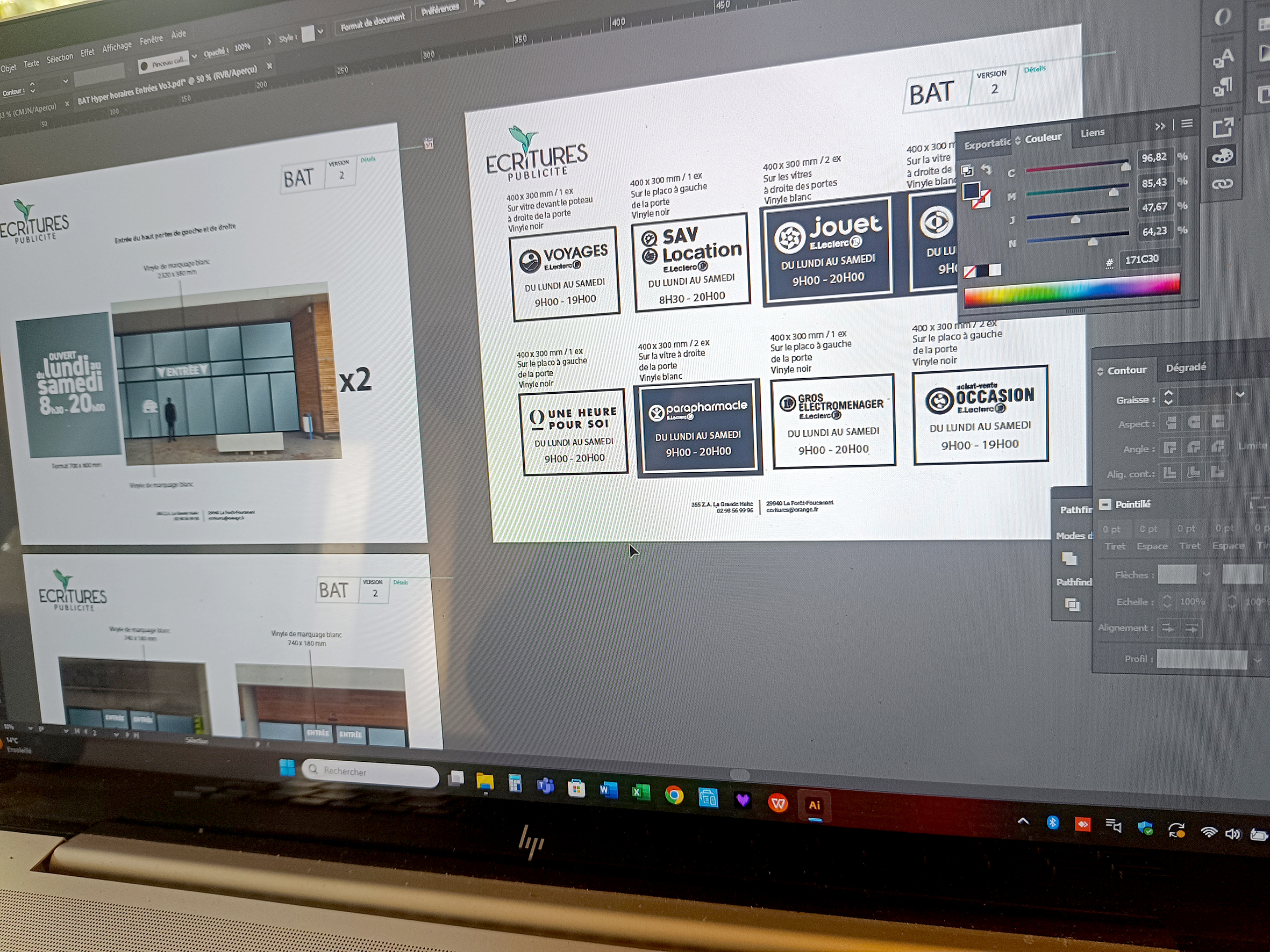 Chez Écritures Publicité, nous mettons notre savoir-faire au service de vos projets avec une approche globale, allant de la conception à la réalisation. Notre expertise couvre l’ensemble de vos besoins en communication visuelle : création graphique, marquage de véhicules et de voiles, signalétique, impression, habillage d’espaces, supports personnalisés…